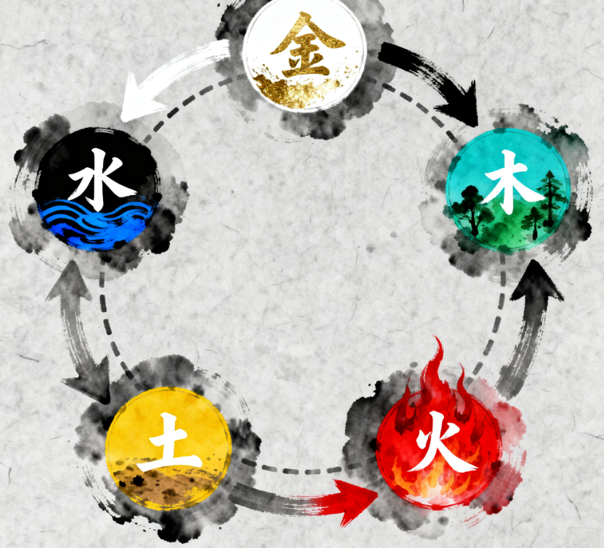 Generating cycle (Sheng): Metal → Water → Wood → Fire → Earth → Metal